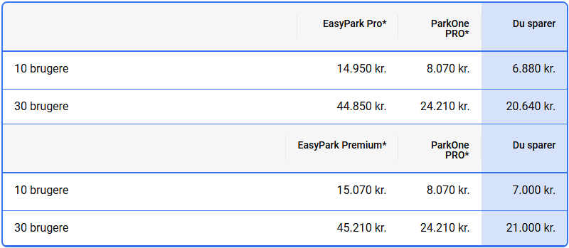 I nedenstående skema har vi vist, hvad en fair pris rent faktisk kan betyde for dig. Vi har valg at sammenligne os med den største udbyder af erhvervsløsninger, nemlig EasyPark.